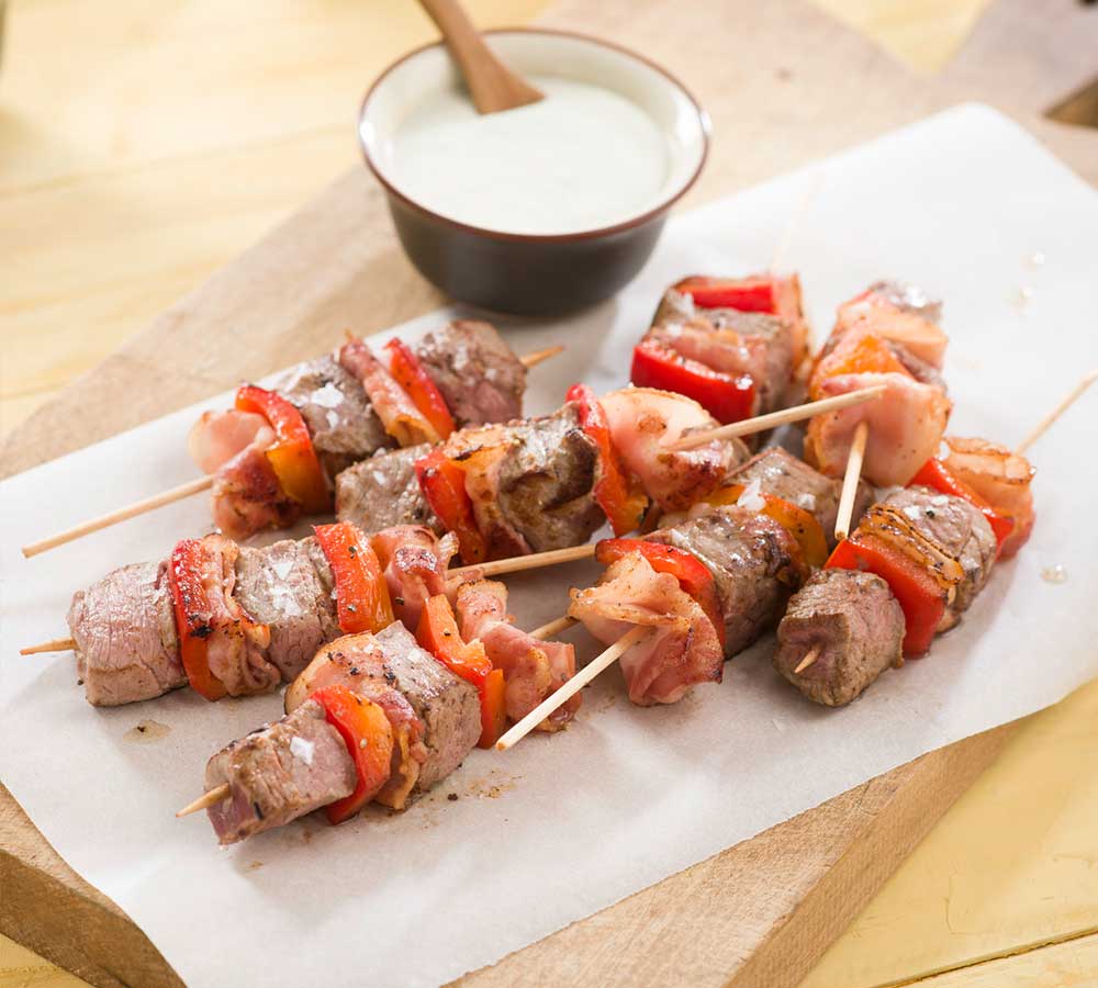 BROCHETAS DE CARNE CON SALSA DE QUESO