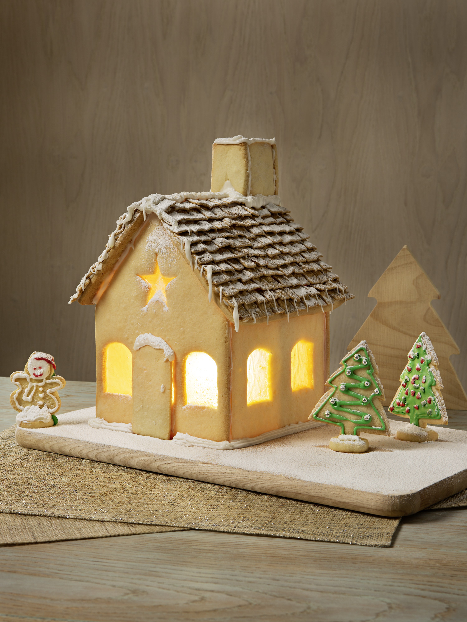- Coloque la casita en una superficie rígida y fíjela con glaseado. Decore con los abetos y espolvoree todo con azúcar flor.