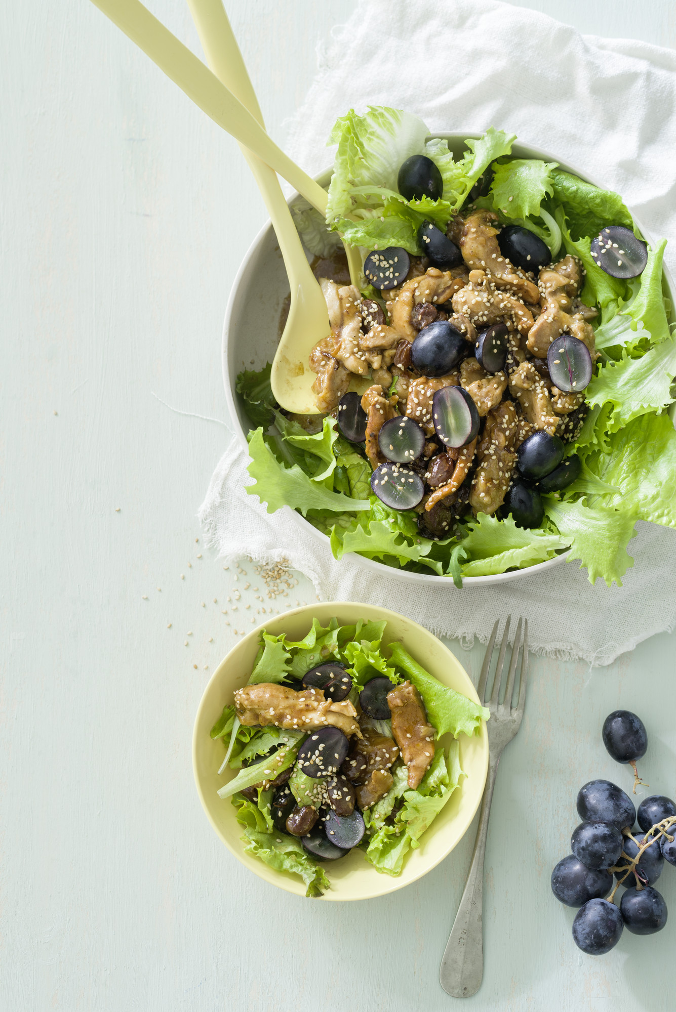 ENSALADA CON POLLO DORADO, UVAS Y PASAS