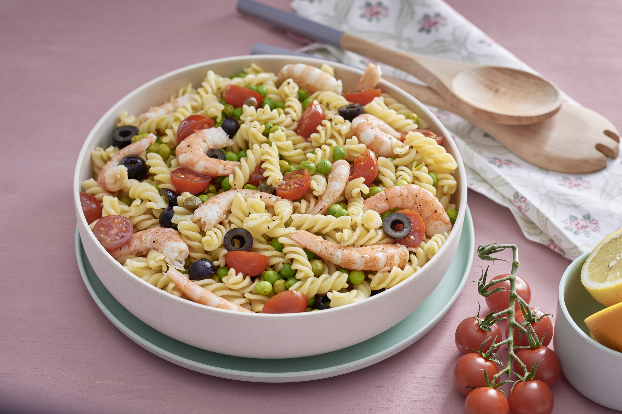 - Añada al vaso la sal, 10 g de aceite, la pasta y programe el tiempo indicado en el paquete/100°C/giro inverso/vel 1. Escurra la pasta en el recipiente Varoma, refrésquela bajo el chorro de agua fría y reserve con las arvejas. Añada al bol con la pasta y las arvejas, las aceitunas, las alcaparras, los tomates cherrys y los langostinos pelados.