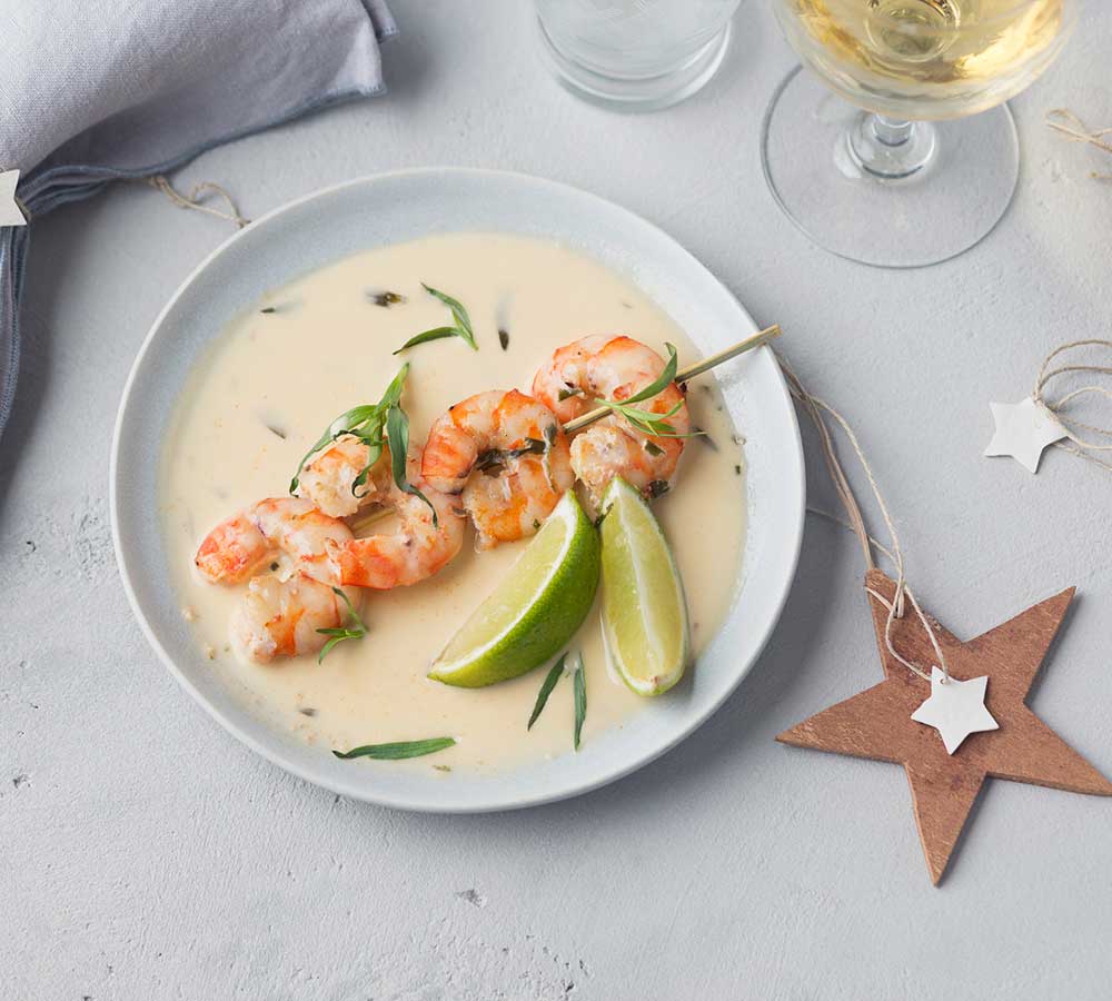 • Pinche cada langostino en una brocheta de madera y riegue con la salsa bien caliente justo antes de servir.