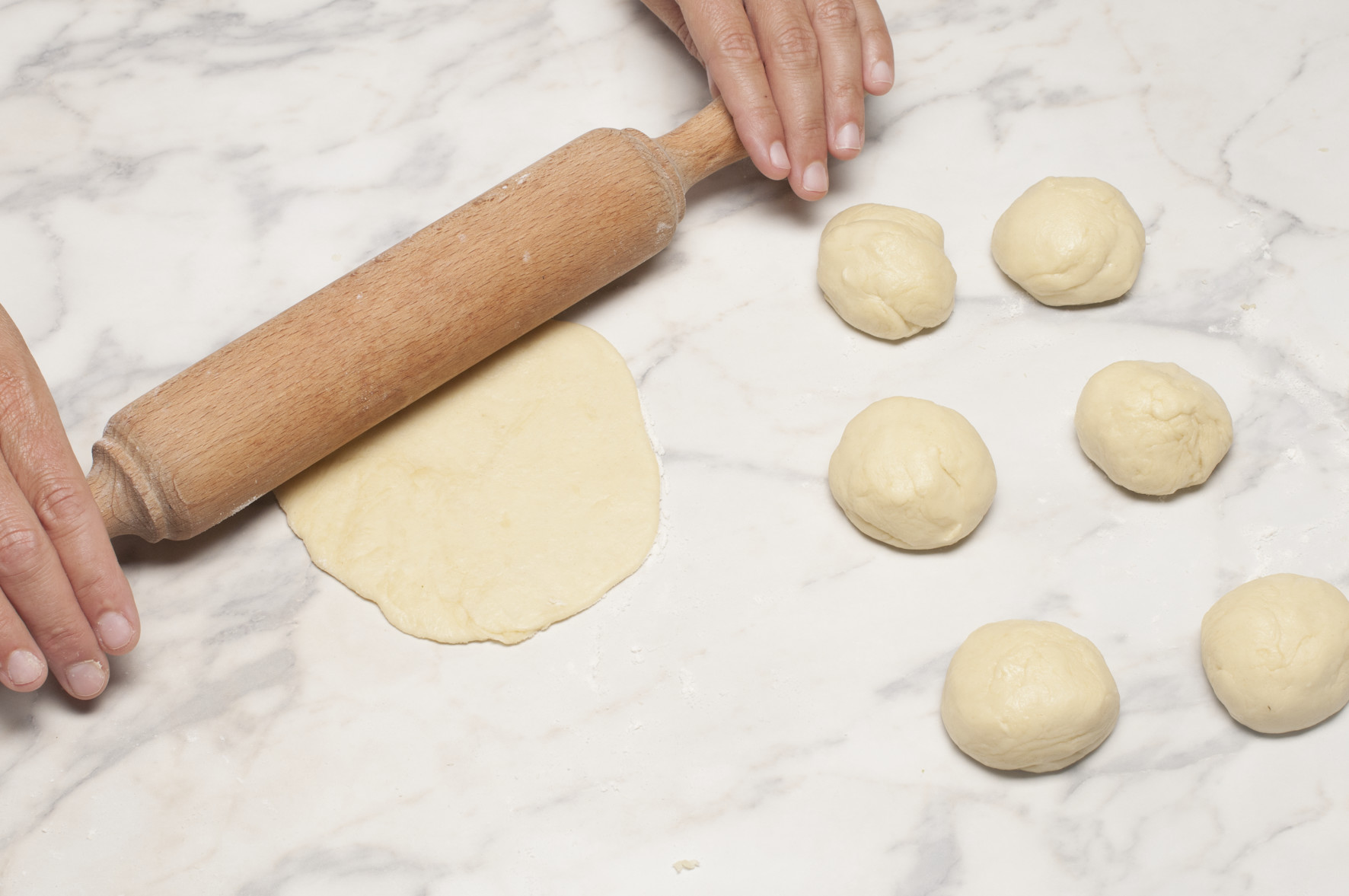4. Sobre una mesa de trabajo ligeramente enharinada, divida la masa en 18 porciones y estírelas una a una con el uslero dando forma circular hasta alcanzar un Ø 16-18 cm y un grosor de 2 mm. Reserve en una bandeja cubierta con un paño de cocina.