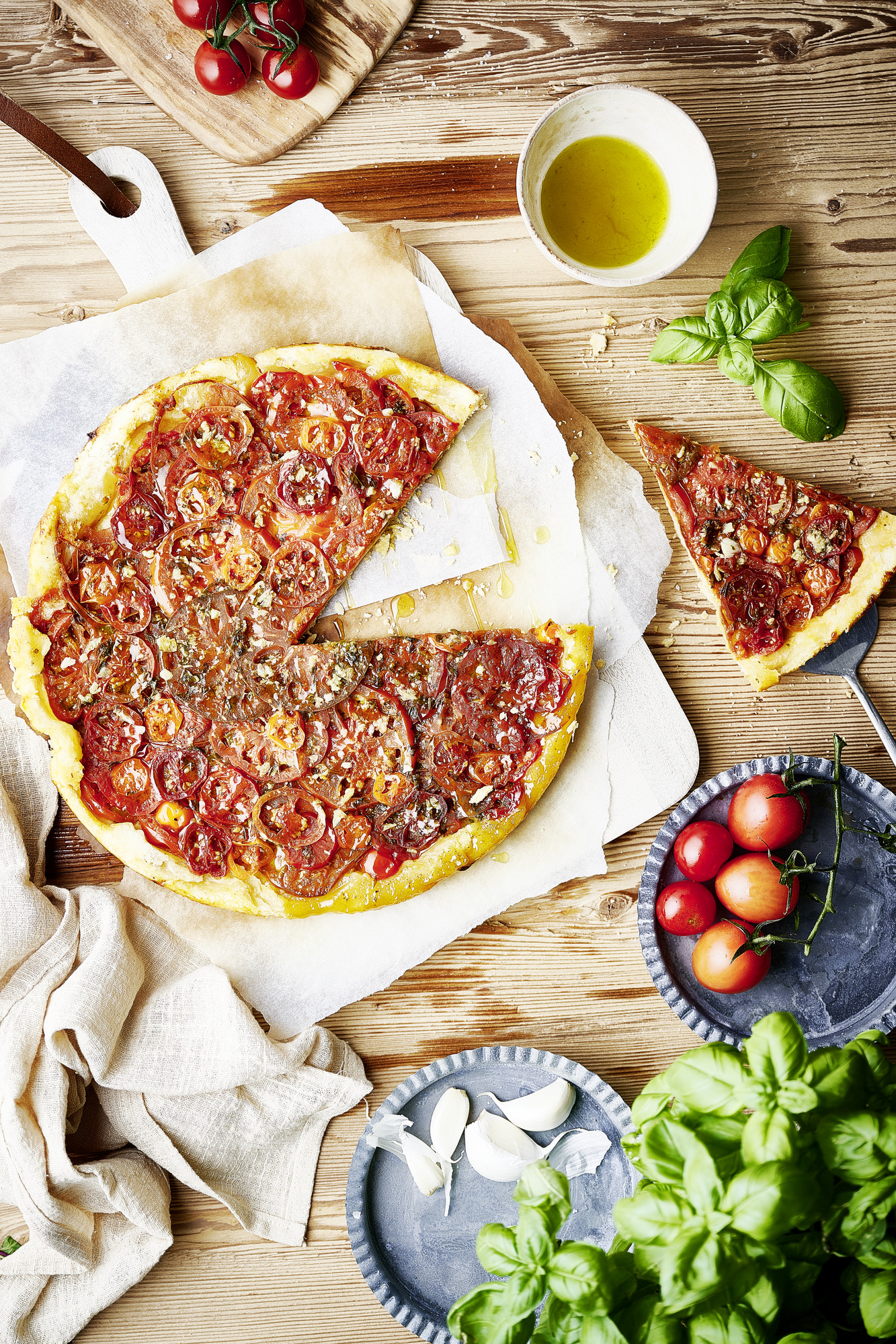 - Hornee (200°C) durante 20-25 minutos hasta que la masa esté dorada. Despegue los bordes con un cuchillo de punta redonda y desmolde dándole la vuelta sobre un plato de servir de modo que los tomates queden arriba y la masa hacia abajo. Sirva caliente o frío (ver sugerencia).
